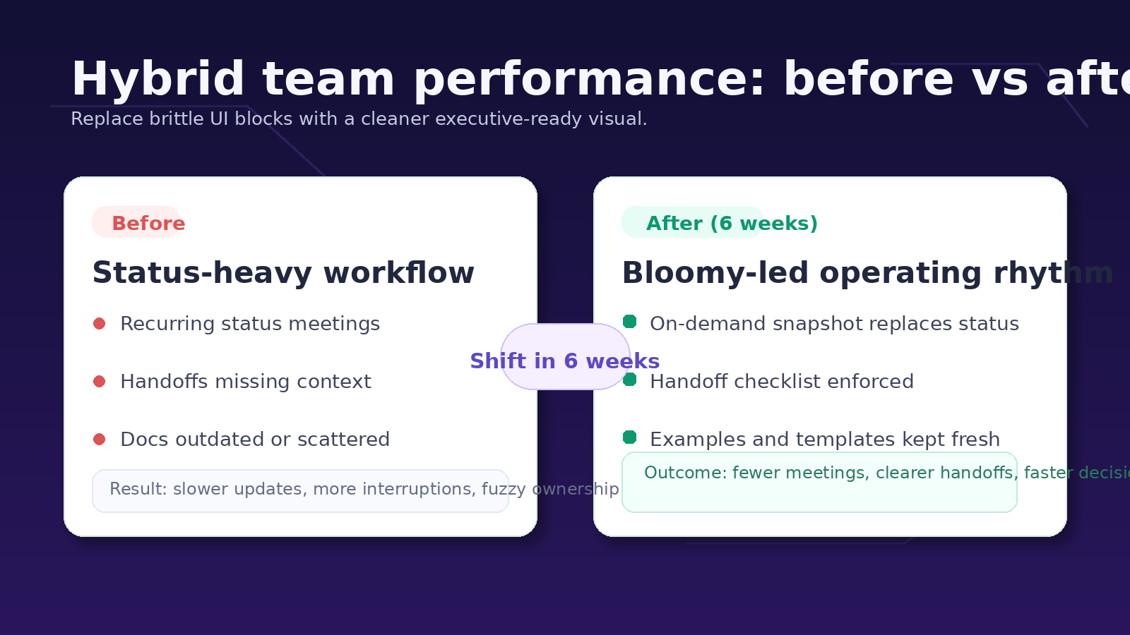 In a six‑week pilot with a hybrid product squad, we replaced two standing status meetings with a on-demand snapshot via Bloomy and async updates. Meeting hours dropped 23% while lead time improved 14%. A lightweight handoff checklist cut “where is this?” pings and reduced reopen loops in the helpdesk by 18%. The team curated a small examples library for docs (before/after snippets), which sped up onboarding and made handoffs clearer between product, design, and engineering.