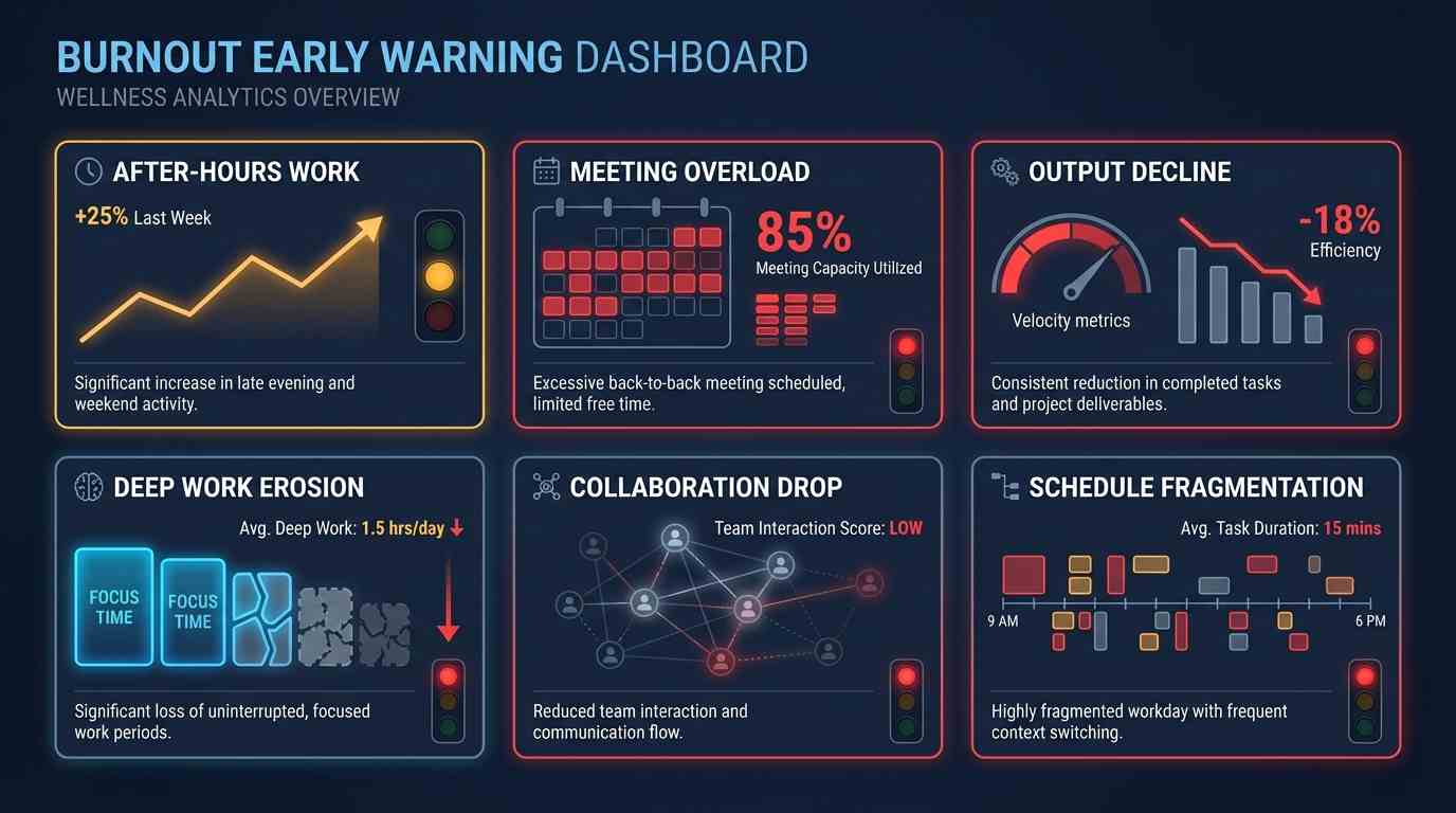 When meeting hours exceed 20/week, burnout risk doubles. The employee has no time for the actual work, so they do it after hours, creating a death spiral.
