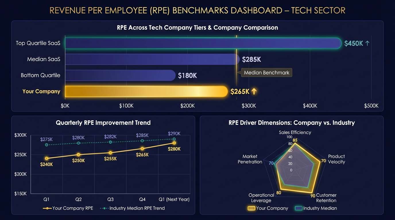 RPE tells investors whether you are scaling efficiently or just adding headcount. SaaS companies with best-in-class RPE ($350K+) are valued at 2-3x higher multiples than companies with $150K RPE, controlling for growth rate.
